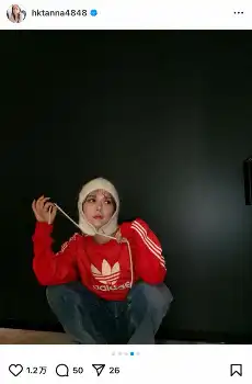「おい!のび太!野球しようぜ!みたいなコーデを組んで出勤して参りました」と謎のネーミングを披露した村重。アディダスの赤のトップスにデニム、スニーカーを合わせたスポーティーなコーデを披露。頭には白いニット帽も被った。