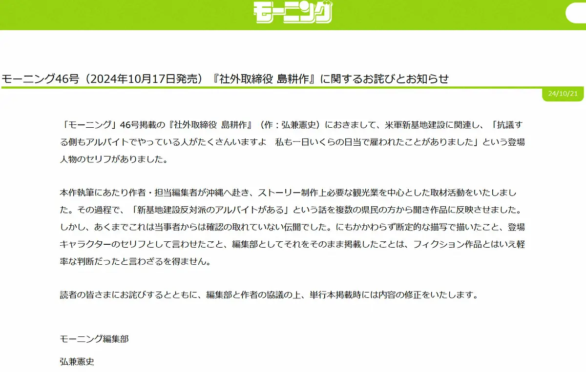「社外取締役 島耕作」を巡っては、「モーニング」10月17日発売号の中で、米軍普天間飛行場(同県宜野湾市)移設への抗議活動を「抗議する側もアルバイトでやっている人がたくさんいますよ 私も一日いくらの日当で雇われたことがありました」などと表現。非難の声が上がったことを受け、同21日に「モーニング」編集部と作者の弘兼憲史氏が同誌公式サイトで「当事者からは確認の取れていない伝聞だった」として「読者の皆さま」へ向けて謝罪した。