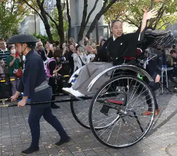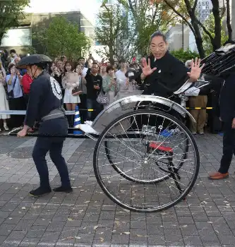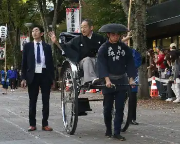 1万人が集まった約450メートルの道を人力車で移動。これまでドラマなどで演じてきた役名にちなみ、沿道からは「大和田常務」「カマキリ先生」などと声をかけられ、笑顔で手を振った。