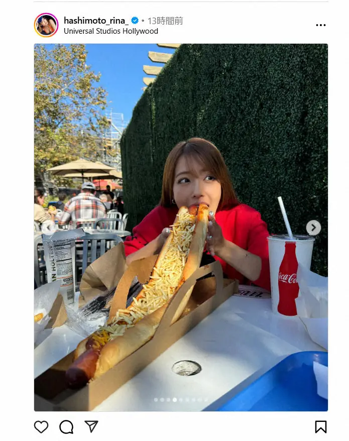 「ホットドッグでか」と巨大なホットドッグにかぶりつく写真もアップした。