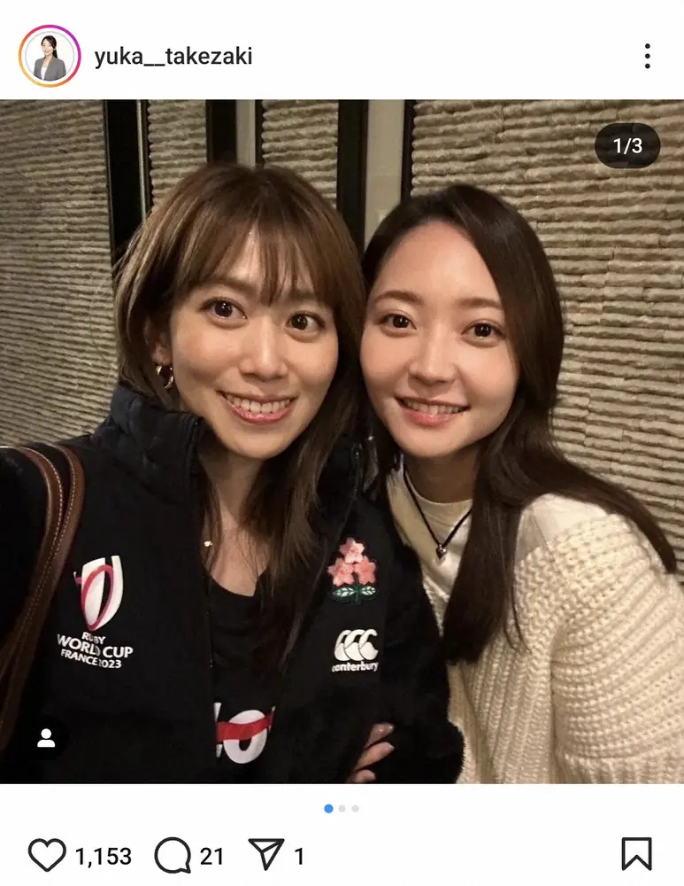 竹崎アナの投稿に、フォロワーからは「素敵な、ツーショット」「美しい」「2人共可愛いですねー」「エンジョイ」「テレ東とNHkのコラボ!」といった反響が寄せられている。