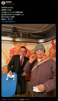 藤井康生アナと北の富士さんの2ショット(@fujii_ucchari) 元NHK藤井アナ 北の富士さんを追悼「せめてもう一度昔話を笑いながら…」… ギャラリーで見る この記事のフォト 2024年11月21日の画像一覧 もっと見る 2024年11月21日の画像をもっと見る