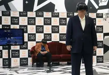 XR体験施設「IMMERSIVE JOURNEY」の開館発表会に出席しXRを体験する吉村作治氏と北野武監督(右)