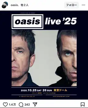 投稿では「日本のみんな 俺たちは君たちのことを忘れてないぜ。 Oasisが来年会いに行くよ」とし「『Oasis Live'25』、日本公演決定!」と日本語で報告。ライブは東京ドームで2025年10月25日(土)、26日(日)の2日間行われる。チケット先行受付は11月22日(金)正午12時スタートする。
