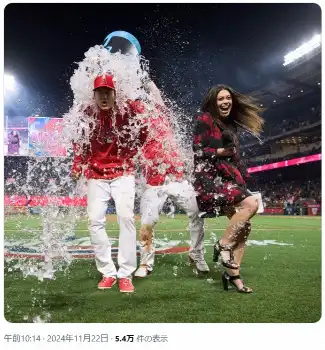 続けて「正直、このロックスターズのキャリアの始まりを取材できたことは本当に幸運だったと思います」と、エンゼルス時代に大谷が初めて本塁打を放ち、水を被っている写真を投稿。「この写真は、エンゼルススタジアムで彼が初めてHRを放ったときのもの」と説明し「彼はゲームを変え、自らの歴史を作ってそして壊している!」と賛辞を贈った。