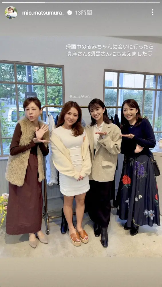 「帰国中のるみちゃんに会いに行ったら真麻さん&須黒さんにも会えました」とハートマークと共につづった。