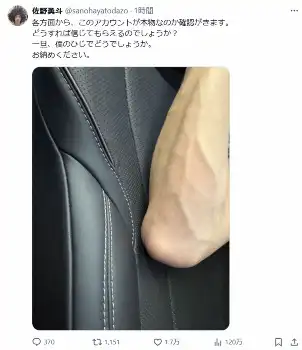 「各方面から、このアカウントが本物なのか確認がきます。どうすれば信じてもらえるのでしょうか?」と嘆いた佐野。「いったん、僕のひじでどうでしょうか。お納めください」と血管が浮き出た珍しい“肘ショット”を披露した。