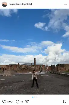 「実は遺跡好き。ポンペイを訪れる日が来ようとは」と書き出した鈴木。憧れの地を訪れ、遺跡を背にダブルピースする写真などを投稿した。
