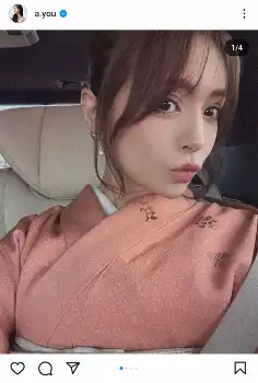 浜崎は車の中での薄紅色の和服姿の自身の姿を投稿。