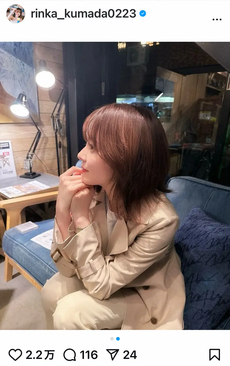 この投稿に、「りんくまちゃん美脚すぎる」「足…綺麗」「女神です」「りんか丈かわいすぎるよーー」「脚長っっ綺麗!!!」「部屋着りんか丈よすぎる」「本当スタイル良くて美人で、惚れ惚れ」「どの角度からのお写真もとてもかわいい」「会社員役だからりんか丈ないかと思ってた!」「ドラマの中でこの美脚が観れるだと!?」などの反応が寄せられている。