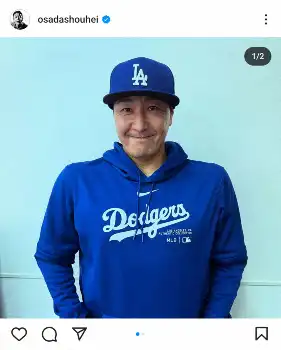 長田は米大リーグ、ドジャースのキャップとパーカーを着た姿を投稿し「大肩庄平」とつづったもの。