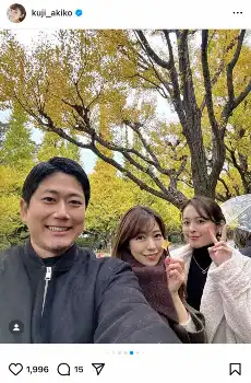 「実は行ったことがない明治神宮外苑イチョウ並木に酒主さんと結衣さんと行ってきました」とつづった久慈。フジテレビの酒主義久アナウンサー、フリーアナウンサーの小野寺結衣と3人で明治神宮外苑のイチョウ並木を訪れたことを報告した。