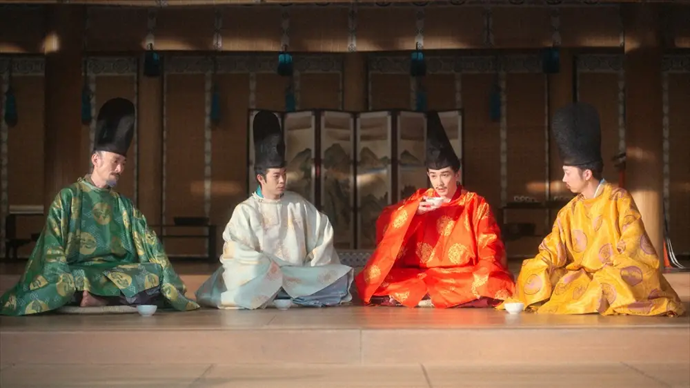 大河ドラマ「光る君へ」第45話。(左から)源俊賢(本田大輔)藤原行成(渡辺大知)藤原公任(町田啓太)藤原斉信(金田哲)は「望月の歌」の解釈を語り合い…(C)NHK