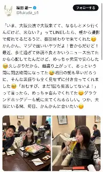 福田氏は「“いま、大阪公演で大阪来てて、なるしとメシ行くんだけど、来ない?”ってLINEしたら、朝から撮影で疲れてるだろうに、撮影終わりで来てくれた」と、橋本と食事を楽しむ姿と橋本が豪快にビールを飲む姿を投稿した。
