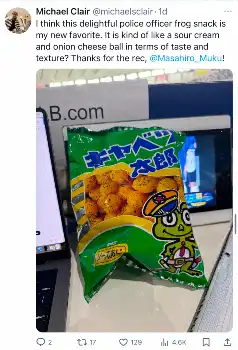 続けて「味と食感はサワークリームとオニオンのチーズボールに似ています」と表現。このスナック菓子をおすすめしてくれた日本の記者に感謝した。