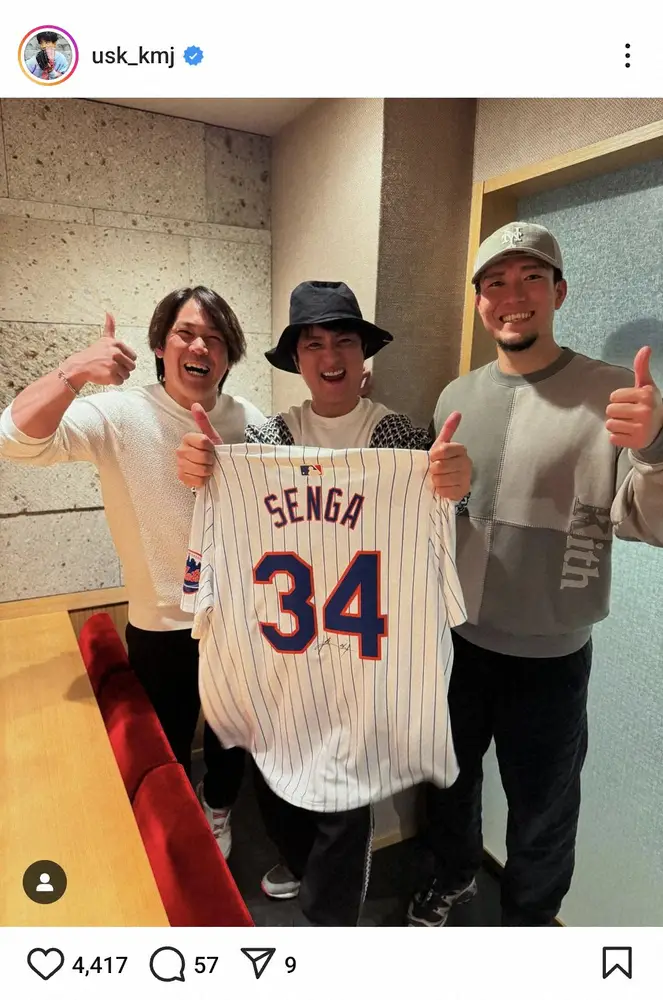 「おめでとう&お疲れ様 #メジャーリーガーの大投手 こーだい #世界に誇るspecial捕手 たくや」と書き出すと、千賀のサイン入りユニホームを手にした自身と千賀、甲斐の3ショットをアップ。