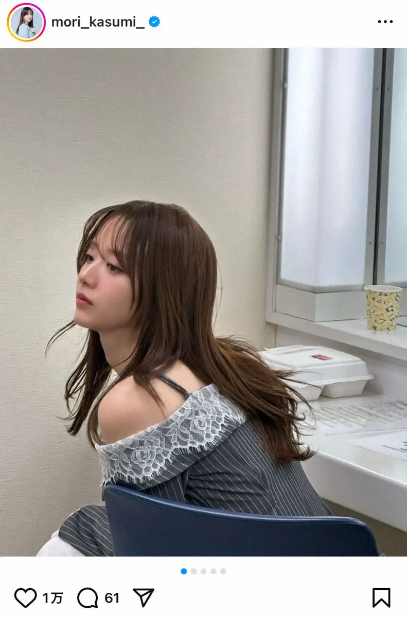 森は楽屋と見られる場所でのオフショットを複数枚投稿。肩があらわになったグレーのトップス姿を披露。ストライプのトップスには白いレースもあしらわれており、甘辛ミックスコーデを着こなした。