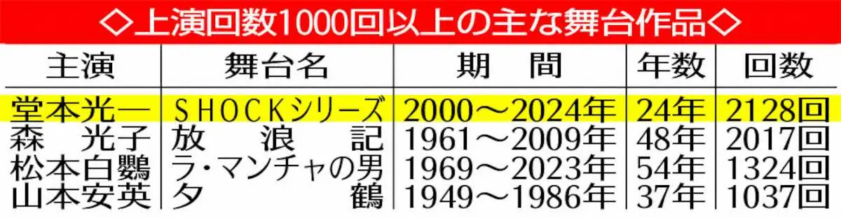 カーテンコールで笑顔の堂本光一(撮影・大城 有生希) Photo by スポニチ 堂本光一 伝説ミュージカル「Endless SHOCK」ついに大千秋楽 24年間212… ギャラリーで見る この記事のフォト 2024年11月30日の画像一覧 もっと見る 2024年11月30日の画像をもっと見る