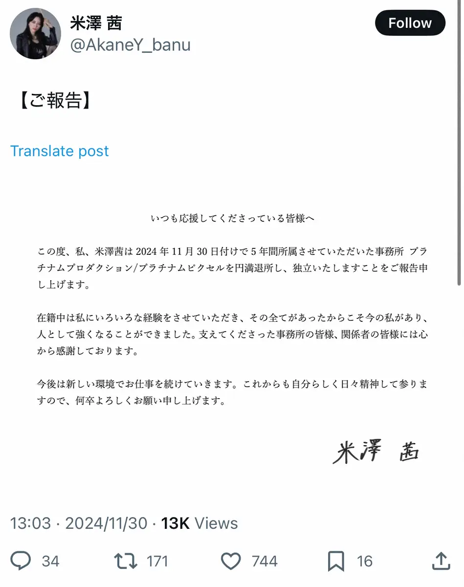 米澤茜のインスタグラム(@akaneyonezawa.banu)から 声優・米澤茜 事務所退所&独立発表「心から感謝」人気バンド「Ave Mujic… ギャラリーで見る この記事のフォト 2024年11月30日の画像一覧 もっと見る 2024年11月30日の画像をもっと見る