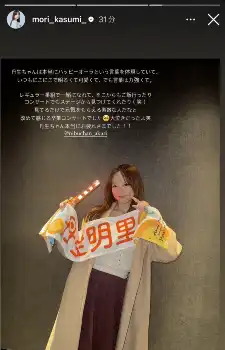 この日、ストーリーズで女性アイドルグループ日向坂46の丹生明里のタオルとペンライトを持ち、笑顔のショットを投稿した森。