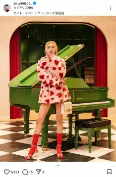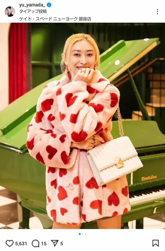 山田は「kate spade new yorkの銀座旗艦店がリニューアルオープンされました!!」とPR。「店内の装飾からはホームタウンであるニューヨークを感じられました」と、ハート柄のハーフコートから足をのぞかせ、ソックスとサンダルを合わせたファッションを披露した。