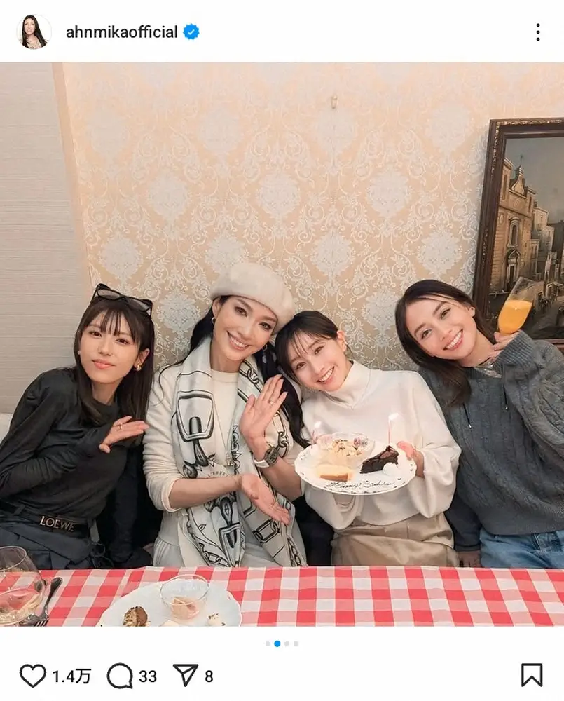 アンミカ「先日、11月がお誕生日だった田中みな実ちゃんのお誕生日会を、滝沢カレンちゃん、若槻千夏ちゃんと開催」と報告。「みんな多忙なのでやっと集えて、幸せな時間でした~」と、タレントの若槻千夏、モデルでタレントの滝沢カレンとともに田中を囲んだ写真を公開した。