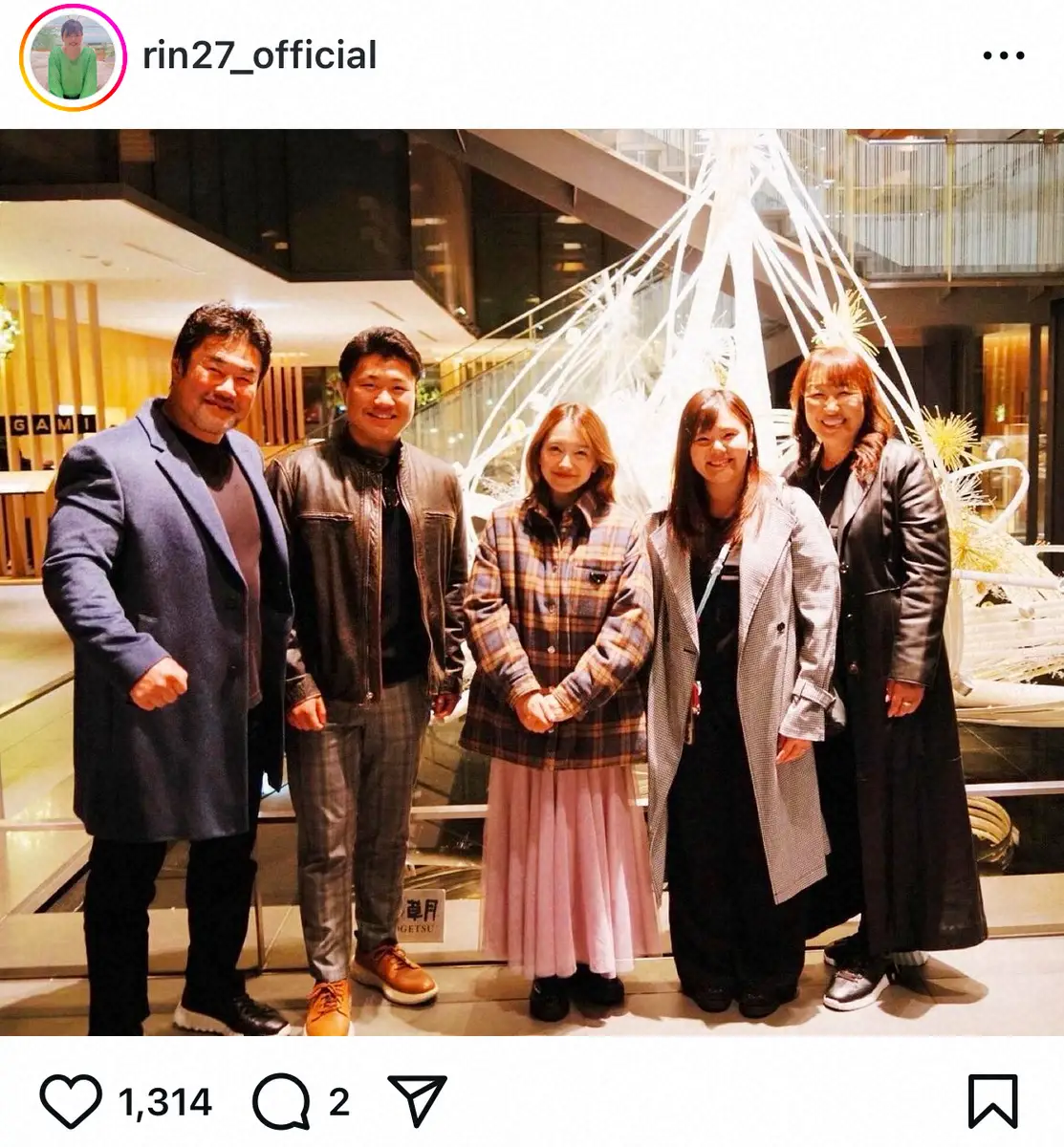 凛は、夫の佐々木健之介さんと、その両親で元プロレスラーでタレントの北斗晶、佐々木健介夫妻、シンガーソングライターのmiwaとの集合写真をアップ。