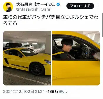 大石昌良 愛車の車検時の代車が「バッチバチ目立つポルシェ」と報告に「うれしそう」「似合う」の声