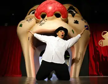 《五感で感じる展覧会》木梨の幅広い創作活動を五感で感じることのできる展覧会で、八つのエリアから構成されている。入ってすぐに木梨の大きな顔と床のプロジェクションのエリアがお出迎え。顔を触れたり床を踏むことで、さまざまなギミックを楽しむことができる。