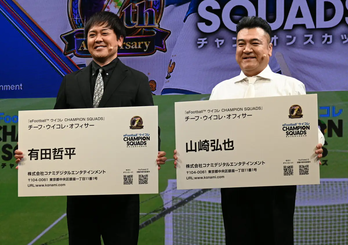 「eFootball ウイコレ CHAMPION SQUADS」は、世界の人気サッカー選手が実名実写で登場し、選手と戦術を組み合わせて遊ぶ、株式会社コナミデジタルエンタテインメントによるモバイルサッカーゲーム。この日は、「ウイコレ」の熱狂的なプレーヤーでもある有田と山崎がチーフ・ウイコレ・オフィサー就任式に登場した。