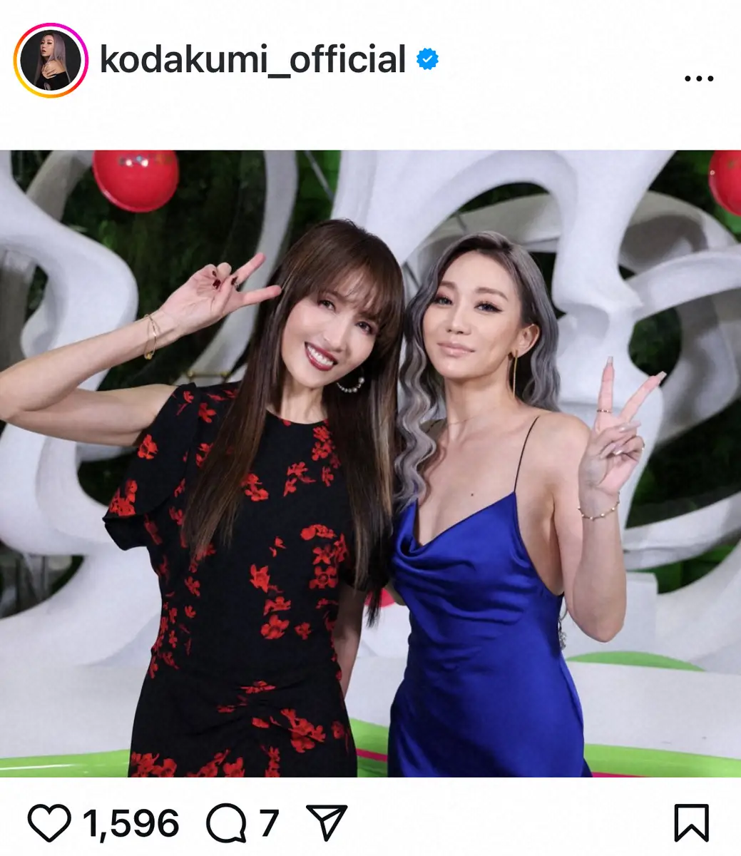 倖田は「本日一緒に慟哭を歌唱させていただきました、工藤静香さんと」と青のセクシーなドレス姿を着た自身と、生放送でコラボした歌手の工藤静香とのショットを披露した。