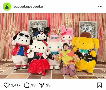 ハローキティ、シナモンロール、ポムポムプリン、ポチャッコ、クロミ、マイメロディとの集合写真を投稿。キャラクターたちとの「ギリギリダンス」動画も公開した。