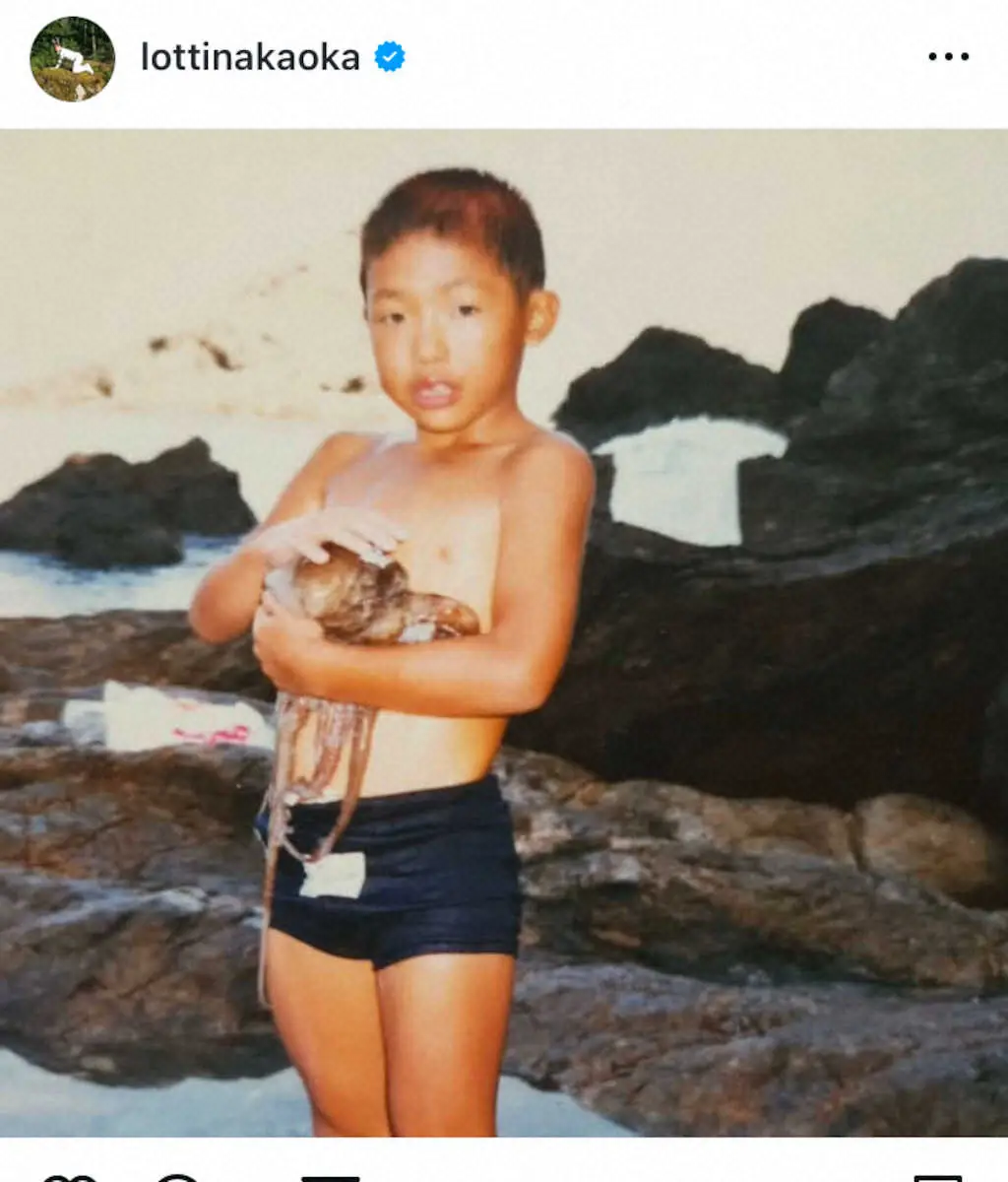 「47歳になった中岡」と始めた中岡は、「タコを捕まえて喜んでた少年中岡が47歳の中年中岡になりました!」と投稿。中岡とみられる水着の少年が、海岸でタコを抱きかかえる珍しい写真を掲載した。