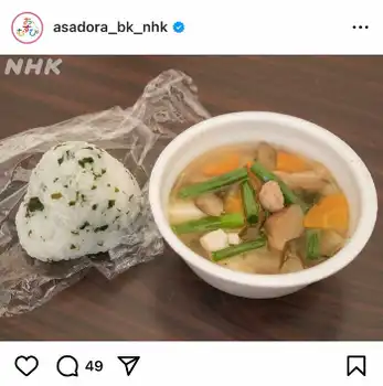 同アカウントは「みんなで作った炊き出しのメニューは、ワカメご飯のおむすびとツナサバけんちん汁。実際に作ってもらえるようなメニューにしたいと、料理スタッフこだわりの一品です」とコメントし、作中で橋本が演じる結がこども防災訓練用の炊き出しとして仲間たちと調理し、実際に撮影に使用された料理を公開。