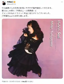 89年にリリースされた中山さんの9枚目のアルバム「Hide'n' Seek」のジャケット写真を添え、「ご冥福を心よりお祈りいたします」と追悼した。中西は同アルバムの「Island Blue」の作曲を手掛けた。