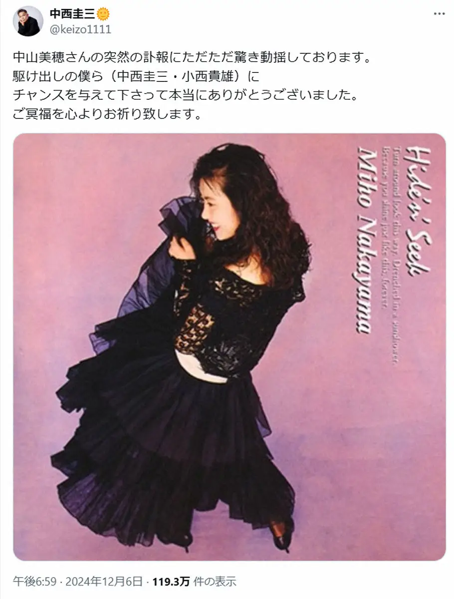 シンガーソングライターの中西圭三(60)が8日までに自身のX(旧ツイッター)を更新。6日に54歳の若さで亡くなった中山美穂さんを追悼した。