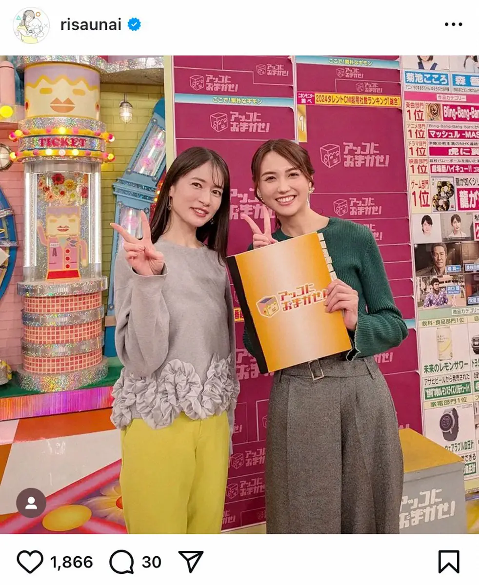 来年3月での退社を発表しているTBSの宇内梨沙アナウンサー(33)が8日、自身のSNSを更新。現在出演中の「アッコにおまかせ!」で、来年1月から後任のレギュラーを務めることが発表された山形純菜アナウンサー(30)とのツーショットを公開した。宇内アナは年内で番組を卒業する。
