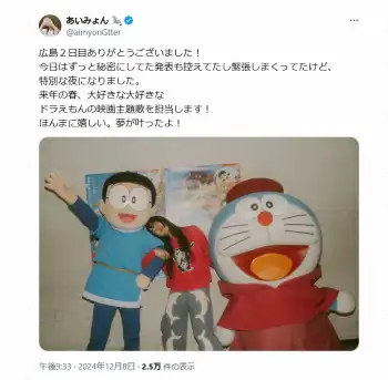 シンガー・ソングライターのあいみょん(29)が8日、自身のX(旧ツイッター)を更新。国民的アニメの劇場版主題歌を担当することを発表した。