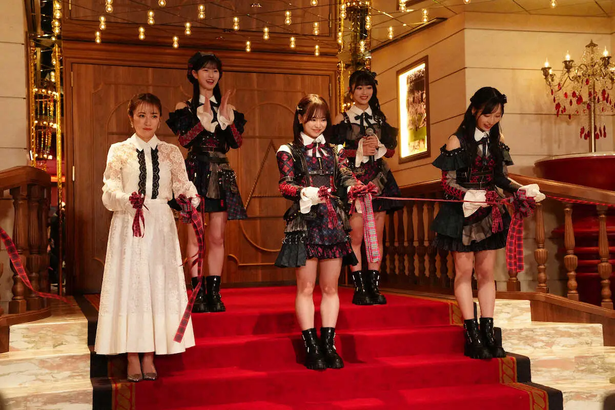 <AKB48劇場リニューアルオープン、新公演「ここからだ」ゲネプロ>テープカットを行う(前列左から)高橋みなみ、倉野尾成美、小栗有以(後列同)八木愛月、佐藤綺星(撮影・大城 有生希)