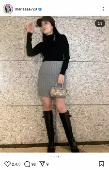 谷まりあ タイトなニット&ミニスカ&ブーツの高級ブランドコーデに「カッコ可愛い」「天使」「最高」