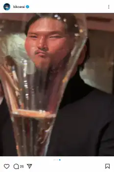 そしてハッシュタグで「謎の美少年現る」と投稿。グラス越しにこちらを見つめる夫の顔が変形した、ユーモラスな写真を掲載した。