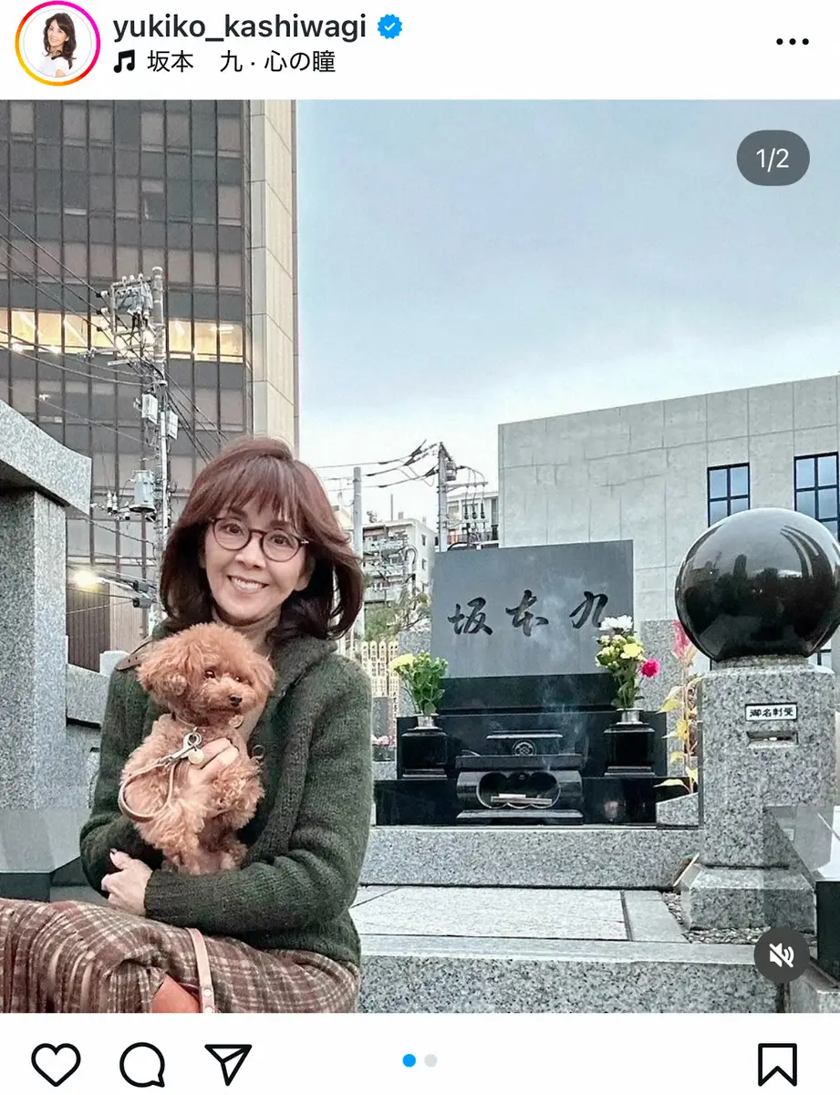 柏木は「今日は結婚記念日です 先日の (輝く!日本レコード大賞)表彰式の報告も兼ねてお墓参りへ」とつづり、飼い犬を抱え、坂本さんの墓前で笑顔を見せる写真をアップした。