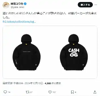 また、10日には「逆におかしいおじさんしか着ることが許されない、40禁パーカーが出来ました」といい、2種類のパーカーを告知。それぞれ「オジ専用」「CASH FROM OG」などと記されている。税込1万7600円。