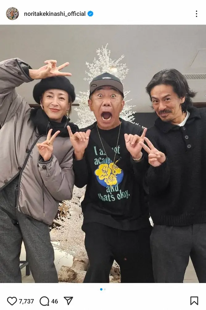 「とんねるず」の木梨憲武(62)が13日、自身のインスタグラムを更新。人気俳優夫妻との3ショット写真が反響を呼んだ。