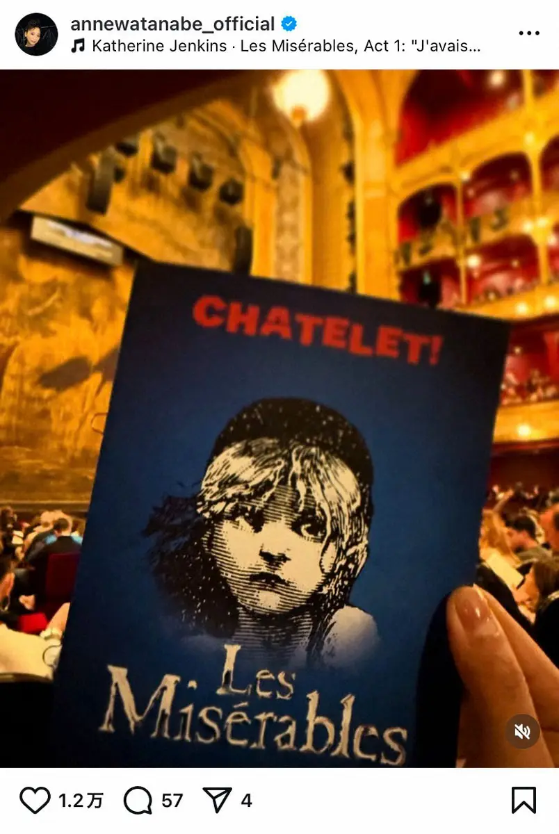 「Les Miserables@Paris」とつづった杏。「CHATELET!」と書かれたチケットを手にしており、歴史あるシャトレ座で観劇したことを明かした。「街が、物語の舞台そのもの。ずっと観たかった夢がかないました!」と興奮気味に振り返った。