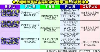 ズムサタは1996年、平日の「ズームイン!!朝!」(79~01年)の週末版として放送開始。巨人の選手を直撃取材する大人気企画「プロ野球熱ケツ情報」などで長年親しまれてきた。同時間帯で個人視聴率、コア視聴率(男女13~49歳)ともに2位。悪くないものの、コアが日曜朝の時間帯で群を抜いてトップの「シューイチ」に変更することで、土曜一日の流れを早朝から一新する狙いとみられる。