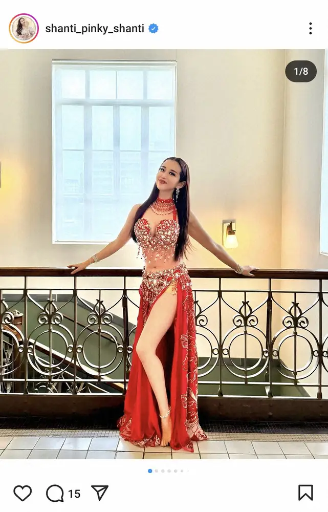 「先日、ベリーダンスの発表会がありました」と書き出すと、衣装姿の全身ショットをアップ。「私は2015年までダンサーとして活動していたのですが、今は趣味でベリーダンスを習っております 紫音先生にベールの振り付けをしていただき、荘厳な雰囲気の曲で踊らせていただきました」と振り返った。