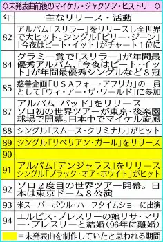 未発表曲の「トゥルース・オン・ユース」は、米ヒップホップ歌手で俳優のLL・クール・J(56)とデュエットしたものと思われる。マイケルは珍しくラップを披露している。また「ドント・ビリーブ・イット(その話は信じないで)」と題された曲は、未成年者への性的暴行疑惑が噂されたマイケルの胸の内を歌ったもののようだ。マイケルが冗談を言うような肉声も収まっていたという。マスグローブさんは「聴いていて鳥肌が立った」と話している。
