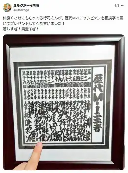 「ミルクボーイ」内海崇のX(@uttakaga)より こんなんナンボあってもいい!?「M-1」王者に贈られた粋なプレゼントに「… ギャラリーで見る この記事のフォト 2024年12月17日の画像一覧 もっと見る 2024年12月17日の画像をもっと見る