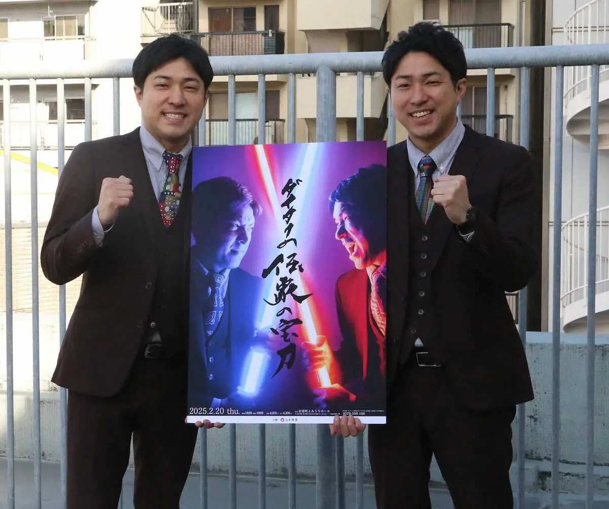 今年の漫才日本一決定戦「M―1グランプリ」では初の決勝進出を果たした。その勢いのまま、来年よみうりホールでライブを行う。ポスターは横山マサト氏撮影で、一卵性双生児の2人が映画「スター・ウォーズ」シリーズに登場するライトセーバーのような電飾を手に切り結ぶ構図となっている。